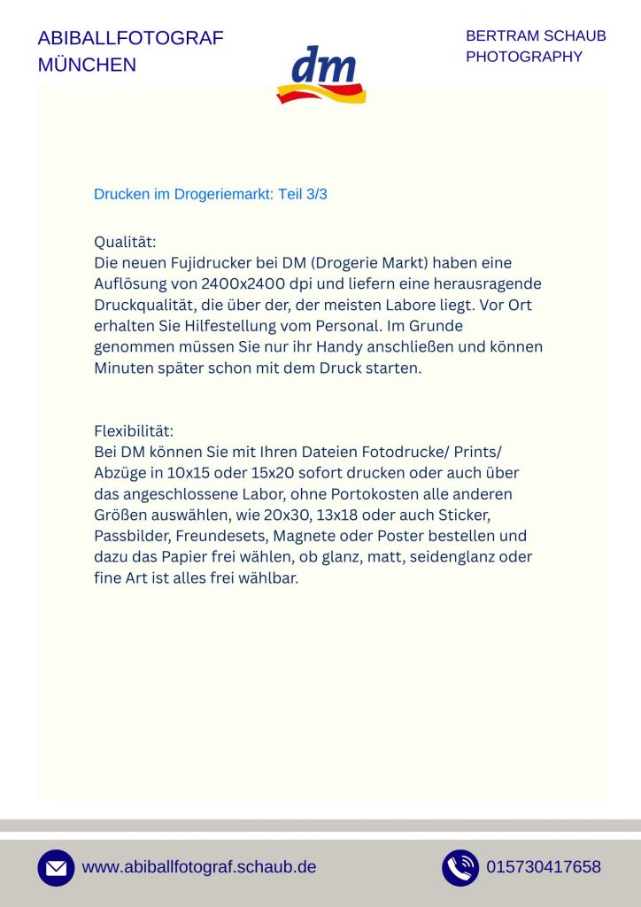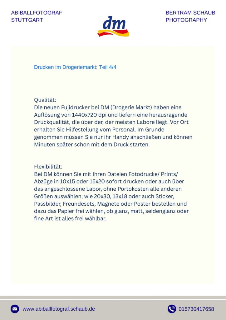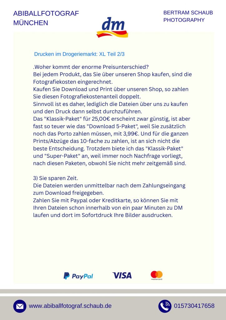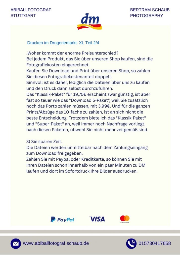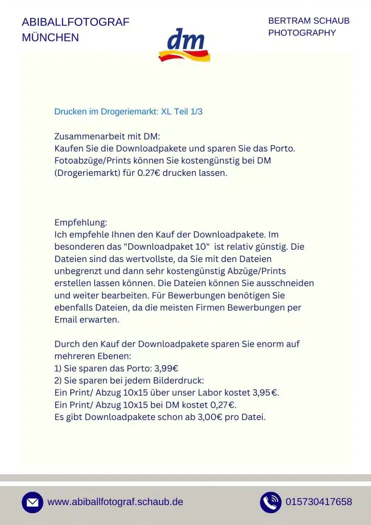 Ich empfehle grundsätzlich den Kauf von Download-Dateien. Dateien bieten maximale Freiheit – ihr könnt später selbst entscheiden, welche Größen, Formate oder Materialien ihr drucken möchtet. Bei DM-Druckstationen kostet ein 10×15-Print nur 0,27 €, während Laborabzüge meist ein Vielfaches kosten. Die Druckqualität bei DM ist hervorragend und steht professionellen Laboren in nichts nach. Downloads sind sofort nach Zahlung verfügbar – bei PayPal oder Kreditkarte meist innerhalb von 10 Minuten.