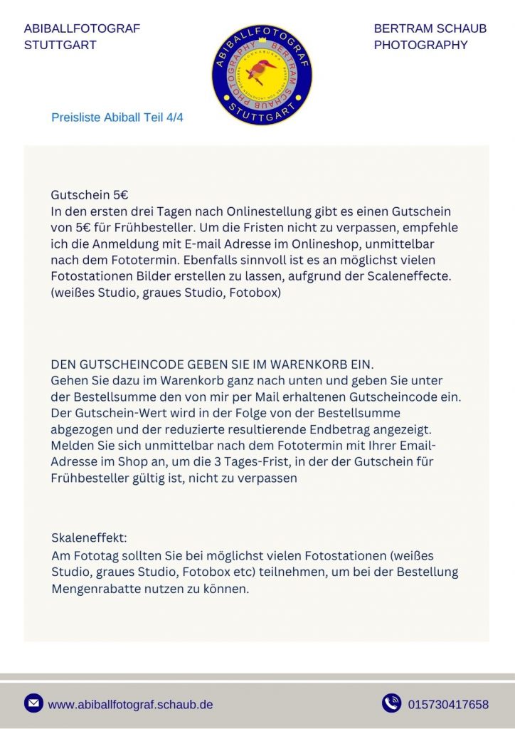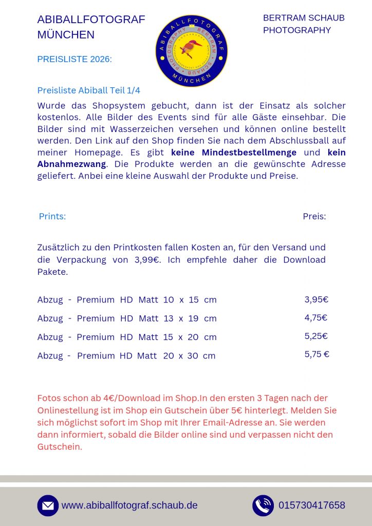 Der Einsatz ist für euch kostenlos. Die Fotos werden über einen Online-Shop bereitgestellt und können ab 1 € pro Download erworben werden. Es gibt keine Mindestbestellmenge und kein Abnahmezwang. Der Shop ist DSGVO-konform, Zahlung erfolgt bequem per PayPal, Kreditkarte oder Überweisung.