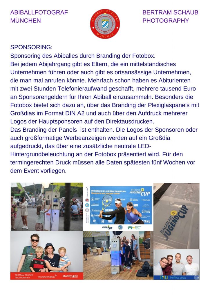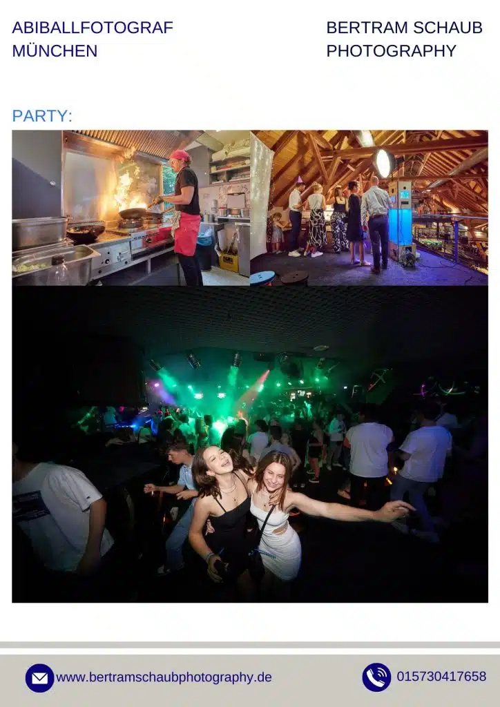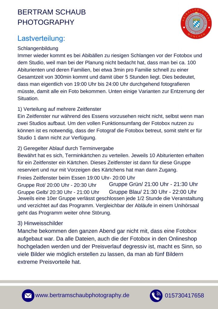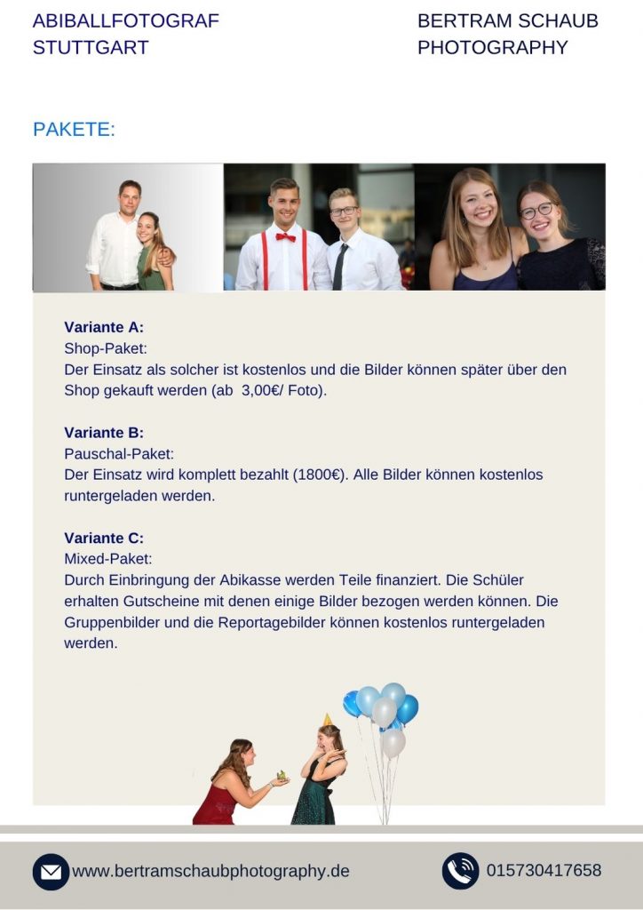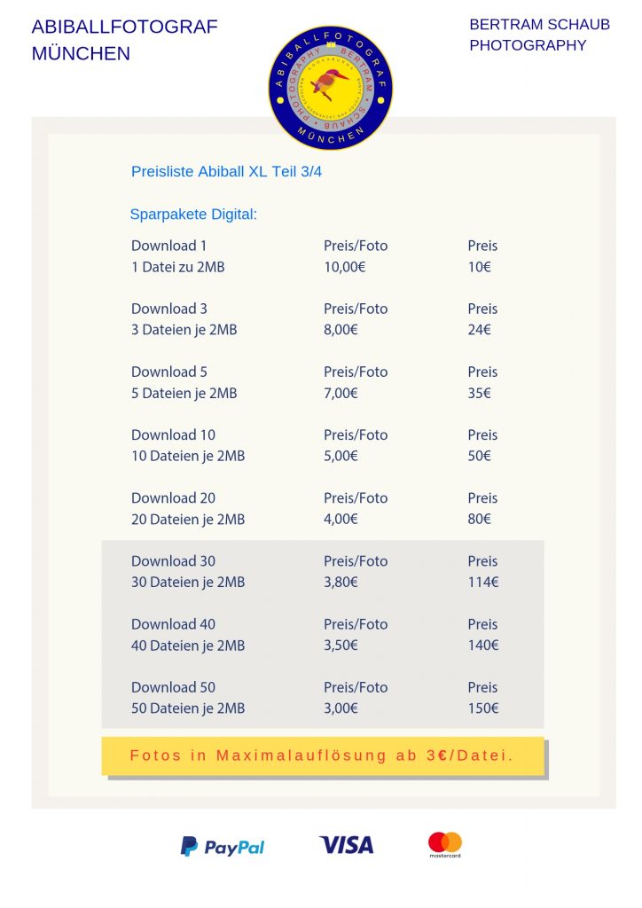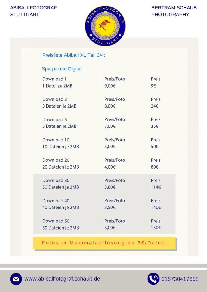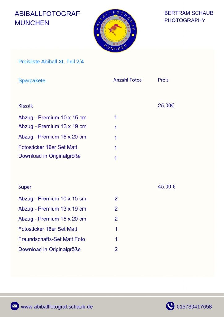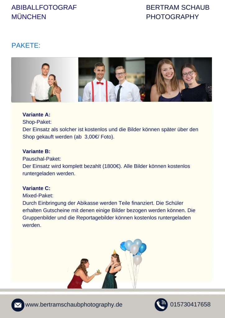Zum Festpreis von ca. 1.800 € ist alles inkludiert: Fotoreportage, Gruppenfotos, Studioaufnahmen und Fotobox. Alle Bilder werden auf einem Server bereitgestellt und können von allen Teilnehmern kostenlos heruntergeladen werden.