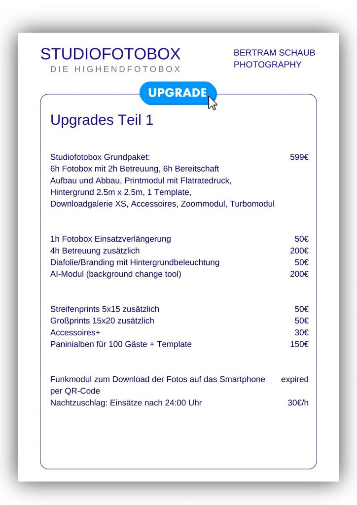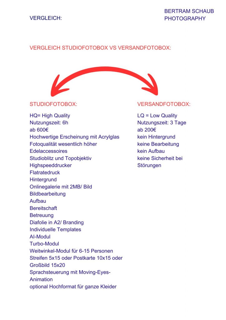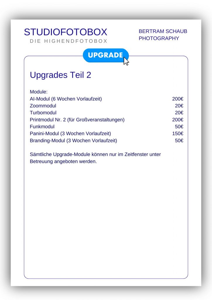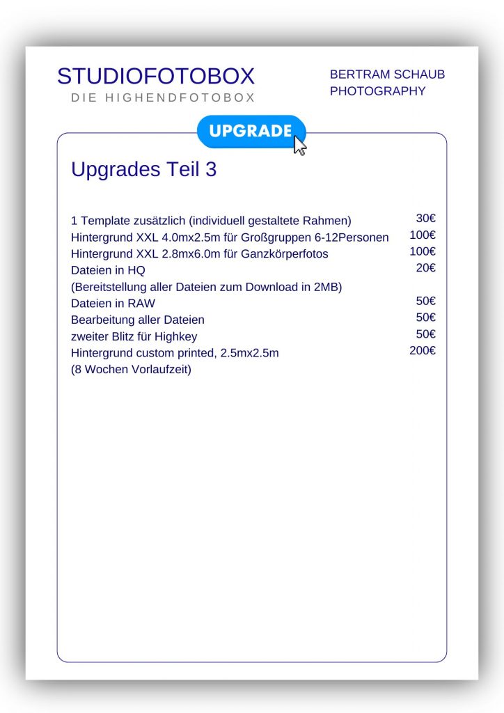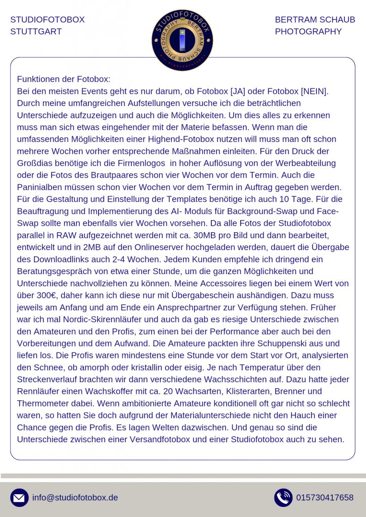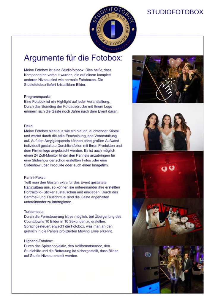Hier können Sie alle technischen Details, Ausstattungspunkte und Optionen der Studio Fotobox im Raum Stuttgart und Böblingen als übersichtliche PDF-Datei herunterladen.