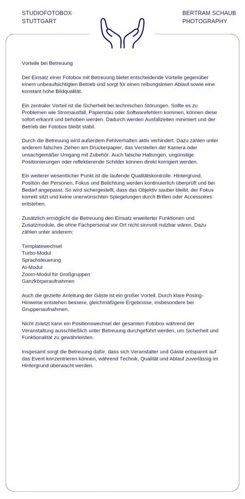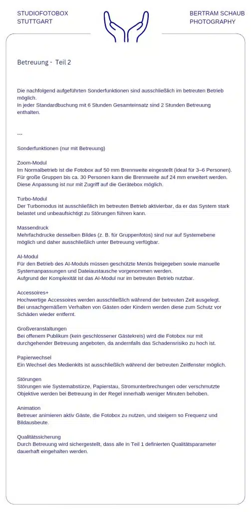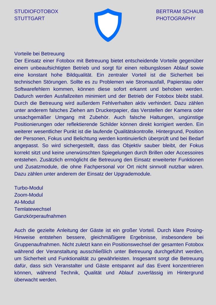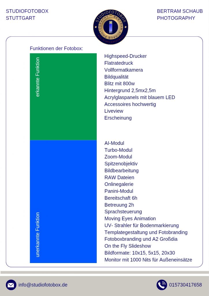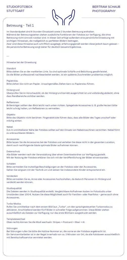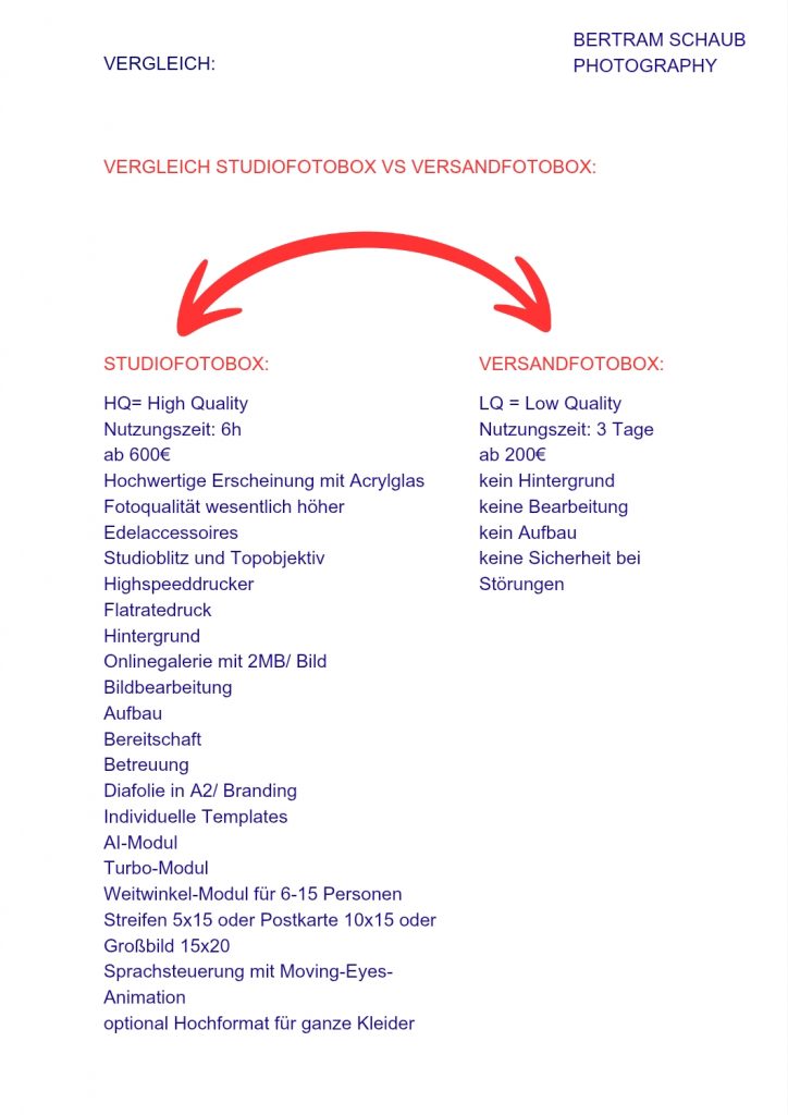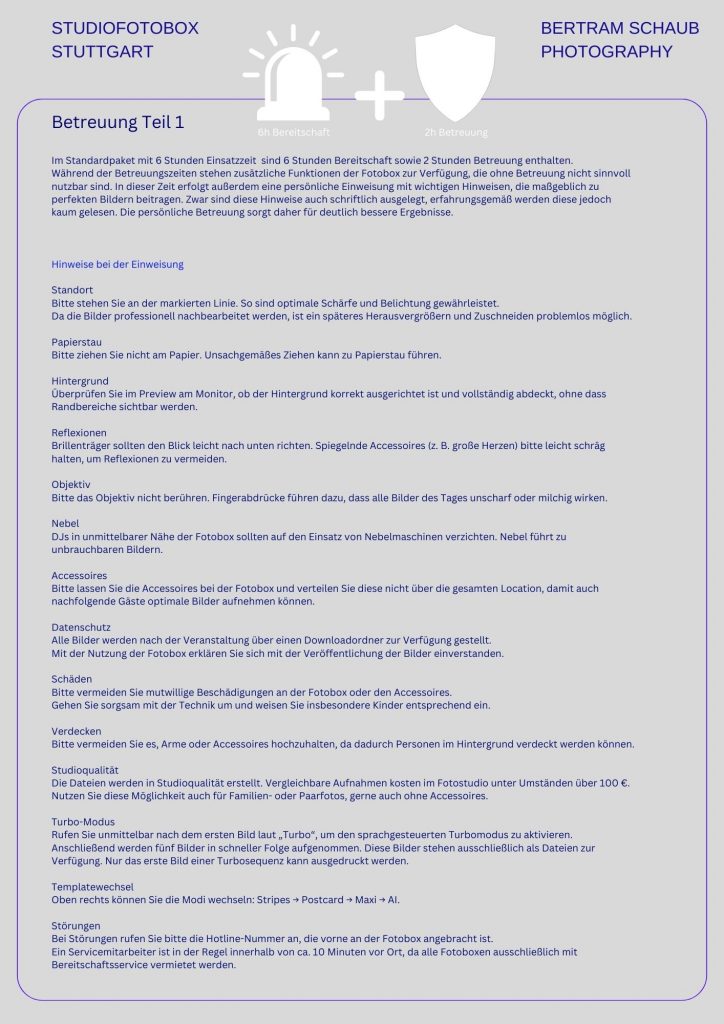 Hier können Sie alle technischen Details, Ausstattungspunkte und Optionen der Studio Fotobox im Raum Stuttgart und Böblingen als übersichtliche PDF-Datei herunterladen.