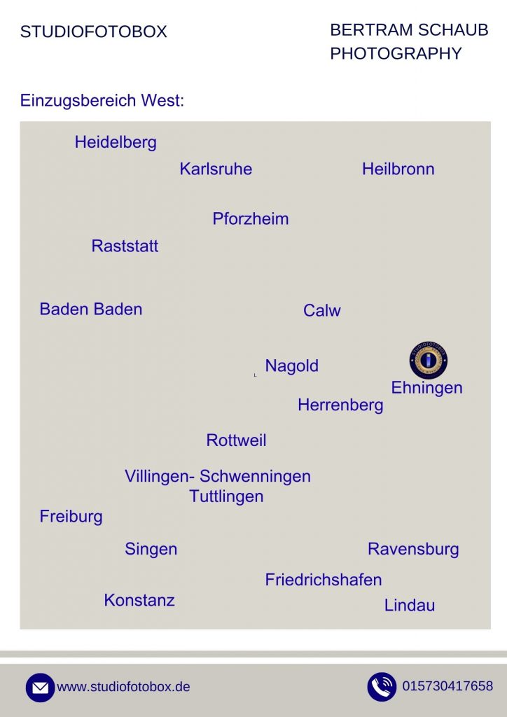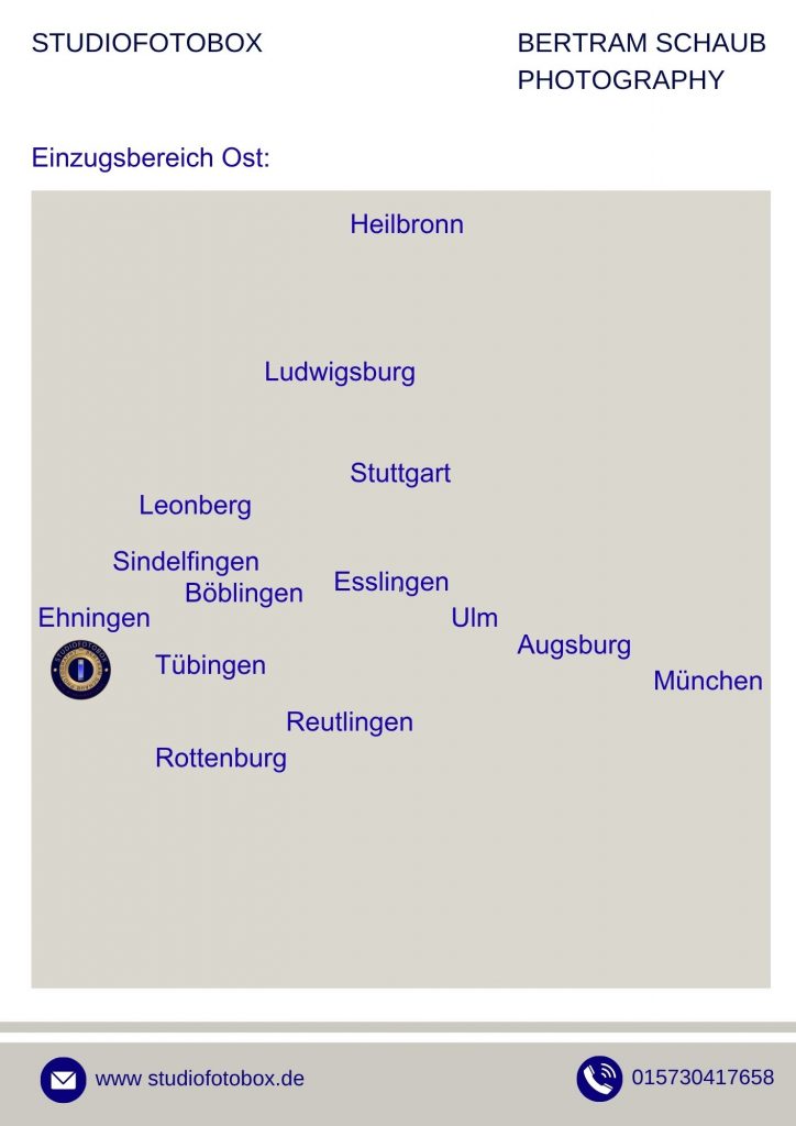 Fotobox in Böblingen, Sindelfingen, Herrenberg, Leonberg, Ludwigsburg, Stuttgart, Esslingen, Reutlingen, Tübingen, Rottenburg, Calw, Nagold. In Ulm, Augsburg, München, Heilbronn, Pforzheim, Karlsruhe, Freiburg, Baden-Baden, Tuttlingen, Villingen-Schwenningen, Konstanz und Zürich fallen Fahrtkosten an.