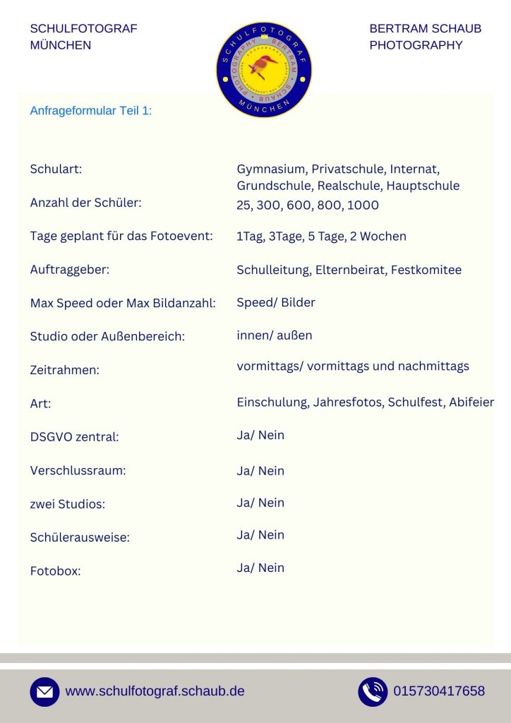 Der Unterschied zwischen Mini-Anfrage und Maxi-Anfrage ist, dass Kunden bei der Maxi-Anfrage schon genau wissen, was sie wollen. Entweder sind es langjährige Kunden oder es ging schon ein Beratungsgespräch voraus oder sie haben schon eingehend die Webseite studiert, so dass sie über die ganzen Auswahlpunkte schon Bescheid wissen. Unabhängig davon werden die Auswahlpunkte in jedem Auswahlmenü nochmal kurz erläutert. Bei beiden Anfragevarianten sind nur die roten Felder Pflichtfelder. Die anderen Felder können ausgefüllt werden oder nicht. Das Formular unten ist ein Entscheidungsunterstützungsformular. Diese Auswahlt dient dann als Grundlage für die Erstellung eines Angebotes. Details können dann vor dem Fototermin mit einem Ansprechpartner der Schule geklärt werden.