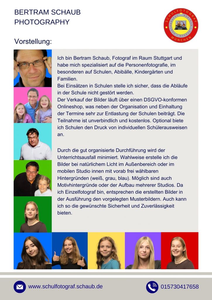 Ich bin Bertram Schaub, professioneller Schulfotograf aus Stuttgart Ich fotografiere Klassen & Einzelportraits mit minimaler Unterrichtsstörung – wahlweise Outdoor im natürlichen Licht oder im mobilen Studio mit frei wählbaren Hintergründen (weiß, grau, blau). Der Verkauf erfolgt DSGVO-konform über einen Onlineshop – ohne Aufwand für die Schule.
